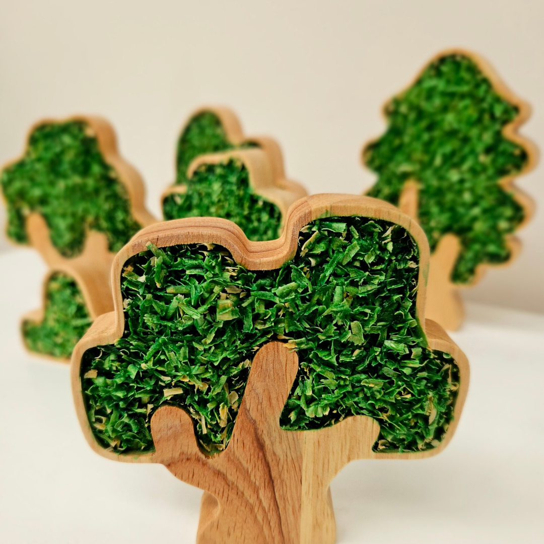 This ‘eco tree play set’ comes in a set of 6. These wooden trees are the perfect accessories to add to other imaginative play toy sets. This product is made of natural wood. It is a natural and eco-friendly material which is safe and durable. Children can explore the rich textures of these trees with their fingertips, experiencing the natural feel of the wood. As these items are crafted from authentic wood, some natural parts may occasionally detach, adding to the tactile and sensory experience.